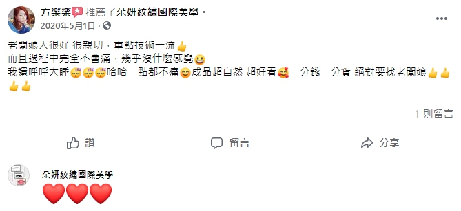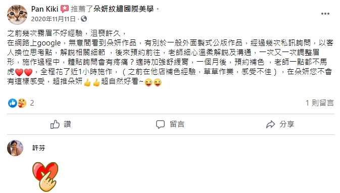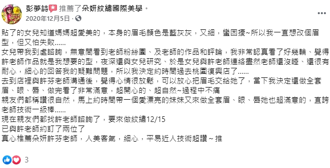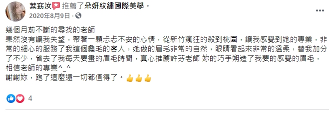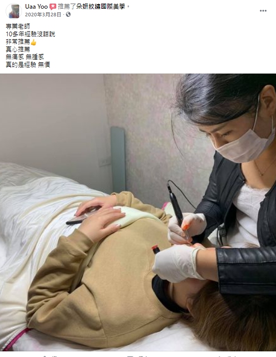 位於桃園的朵妍紋繡國際美學,許芬老師從事紋繡、霧眉、紋唇、嘟嘟唇、眼線、洗眉、改眉,相關美學的服務已有10年的時間。老師本身就是個喜歡自然、高質感,追求細節完美的人!也因為這樣的態度跟理念,在幫每一位客戶操作紋繡、霧眉、紋唇、嘟嘟唇、眼線、洗眉、改眉等服務項目時,甚至比你還要在意你的臉部細節。在教學方面也非常追求責任,每一個教學步驟都要求落實到位,務必要讓每一位學生都有所收穫!
